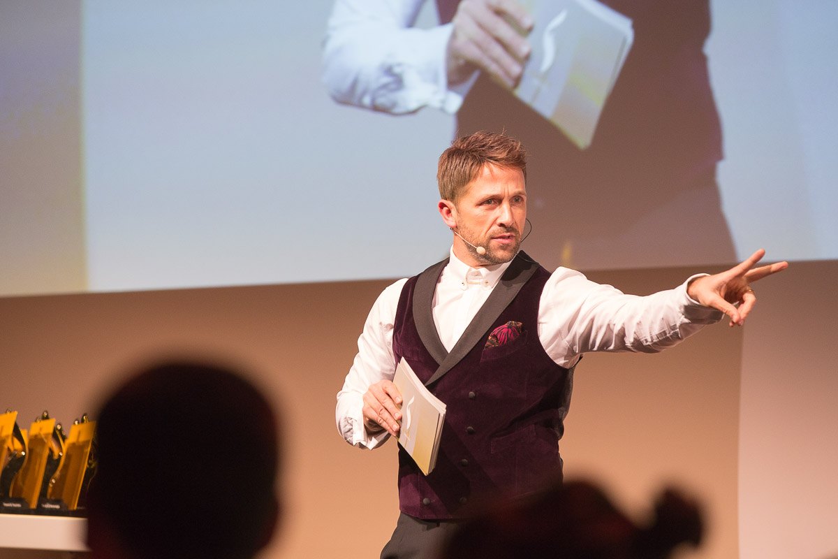 Mann in eleganter Kleidung präsentiert bei den European Excellence Awards, im Hintergrund Auszeichnungen sichtbar.