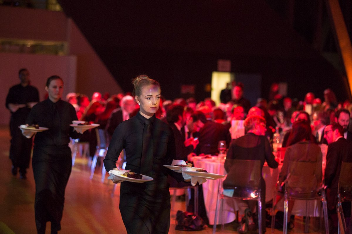 Zwei Kellnerinnen in schwarzer Kleidung servieren Essen in einem festlich beleuchteten Saal mit Gästen an Tischen.