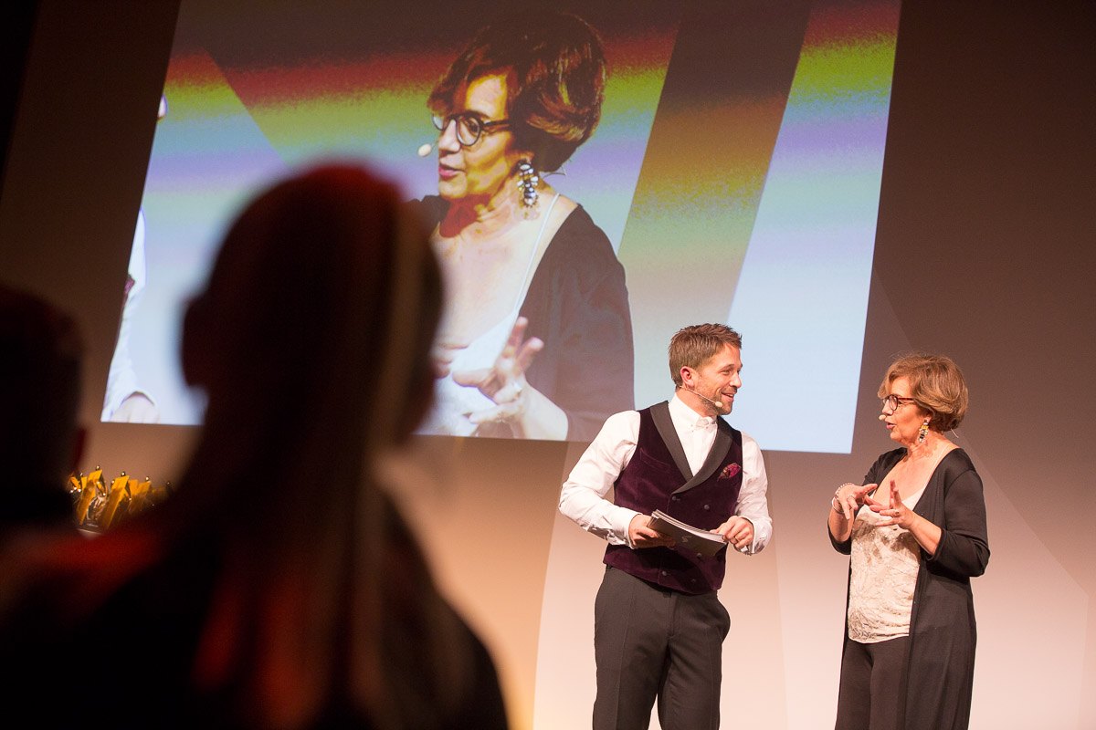 Zwei Moderatoren auf der Bühne bei den European Excellence Awards, im Hintergrund eine große Leinwand mit Projektion.