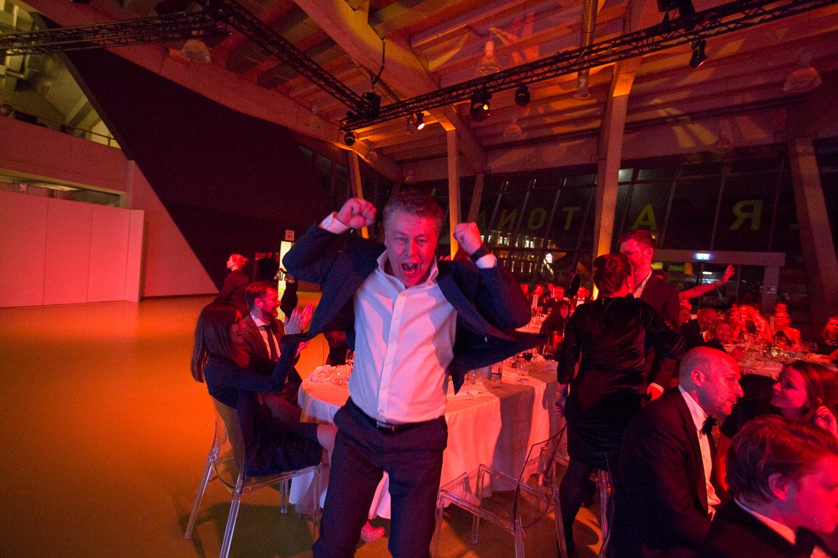Mann in Anzug jubelt begeistert bei der 11. European Excellence Awards Gala im Hamburg Cruise Center.