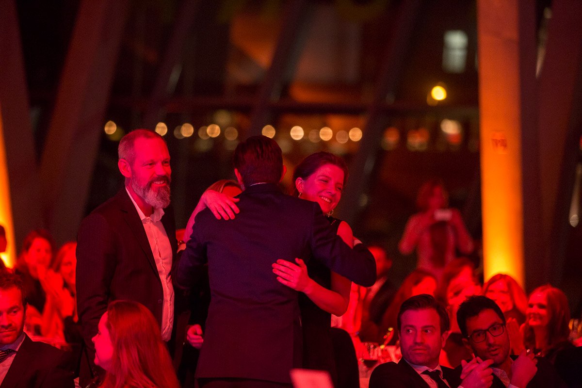 Personen umarmen sich in festlicher Atmosphäre während der European Excellence Awards im Hamburg Cruise Center.