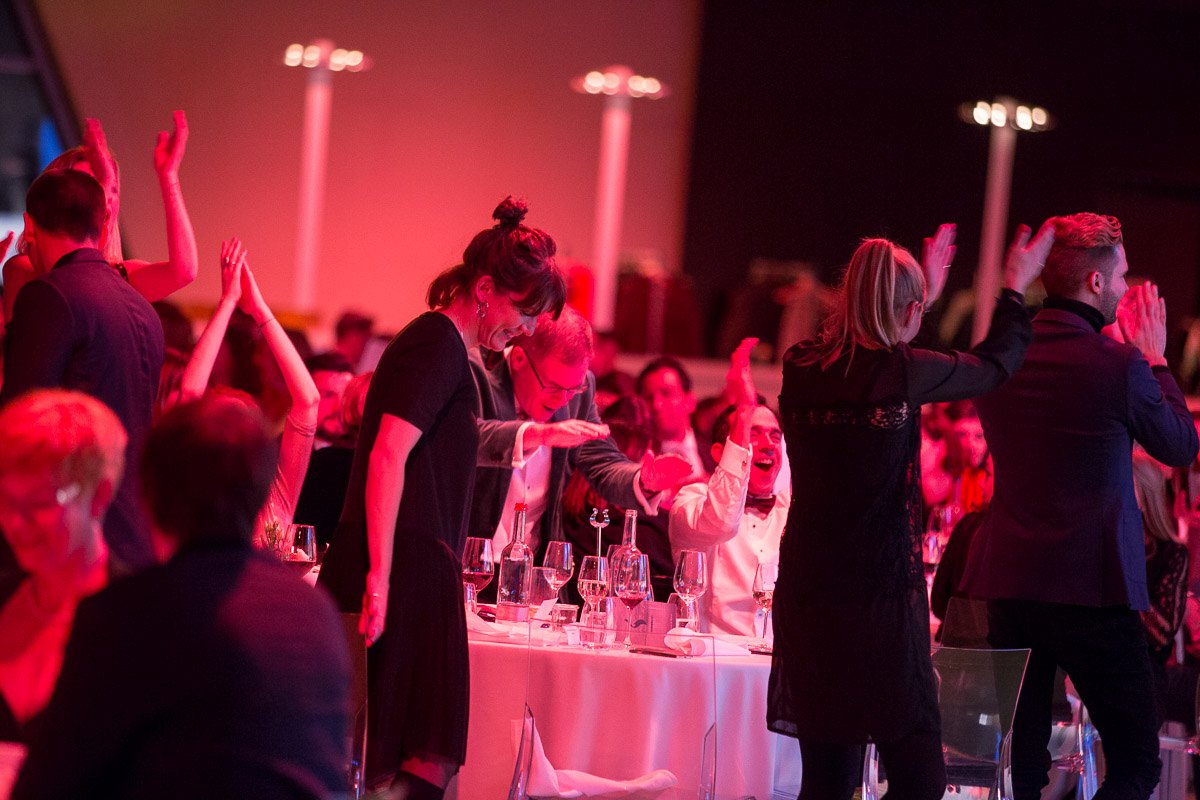 Gäste applaudieren und feiern bei den European Excellence Awards in einem festlich dekorierten Raum.