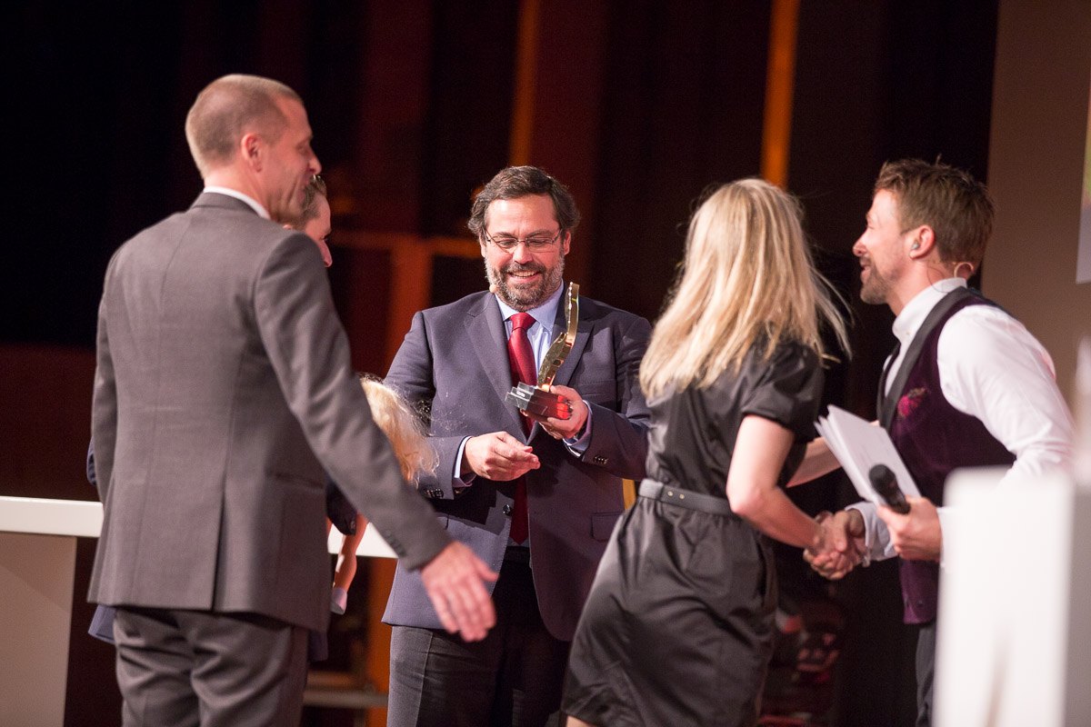Verleihung eines Preises bei den European Excellence Awards 2017, mit mehreren Personen auf der Bühne und einem Pokal.