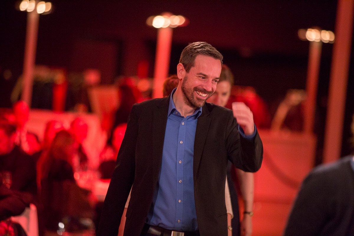 Mann in schwarzem Anzug und blauer Hemd lächelt und gestikuliert in festlicher Atmosphäre bei der Gala.