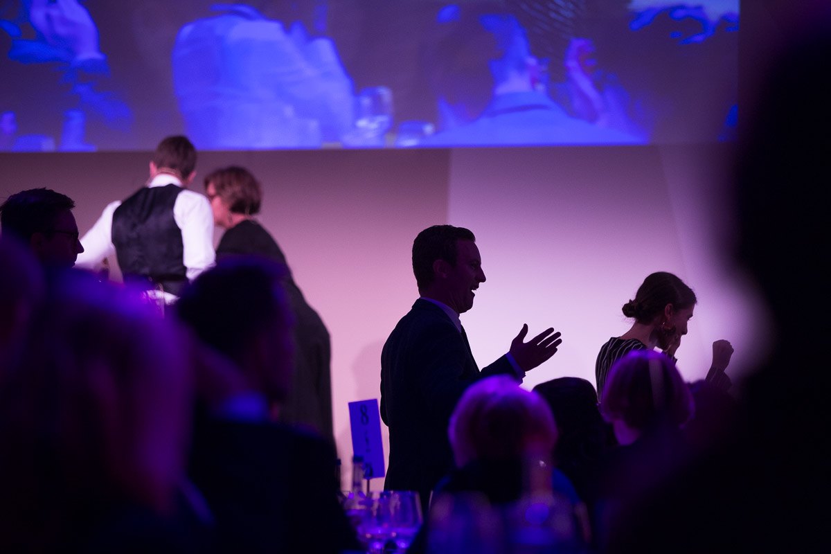 Silhouetten von Gästen bei der Gala der European Excellence Awards, mit blauer Beleuchtung im Hintergrund.