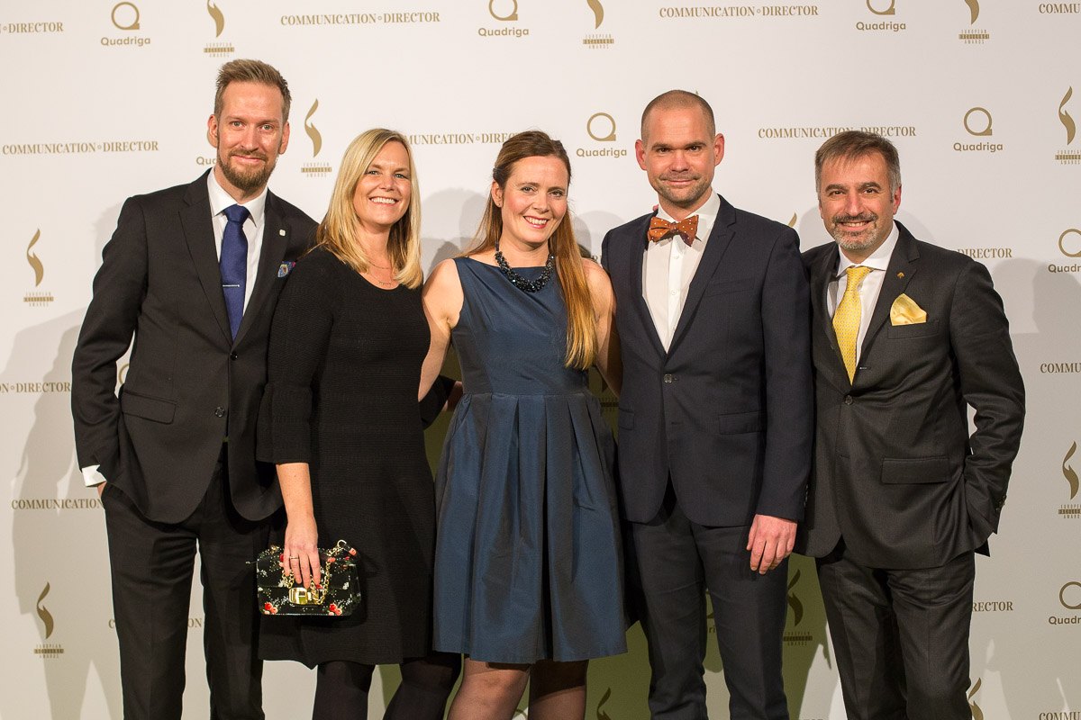 Fünf Personen in eleganter Kleidung posieren vor einer Fotowand bei den European Excellence Awards in Hamburg.