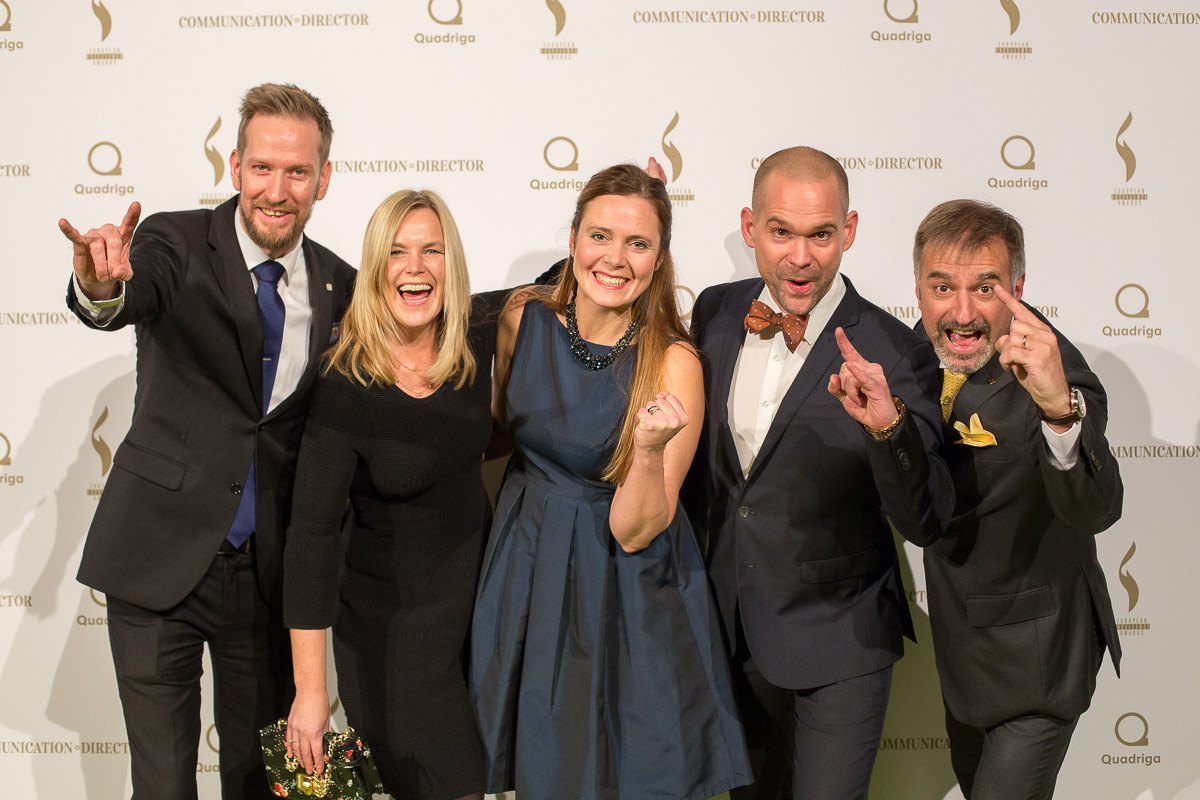 Fünf Personen posieren lächelnd vor einer Wand mit Logos, gekleidet in elegante Abendkleidung.