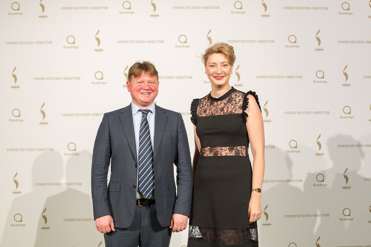 Zwei Personen posieren vor einer Fotowand mit dem Logo der European Excellence Awards in Hamburg.