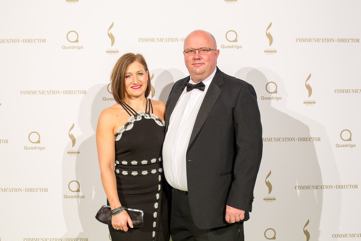 Paar in formeller Kleidung posiert vor einer Fotowand mit Logos der European Excellence Awards in Hamburg.