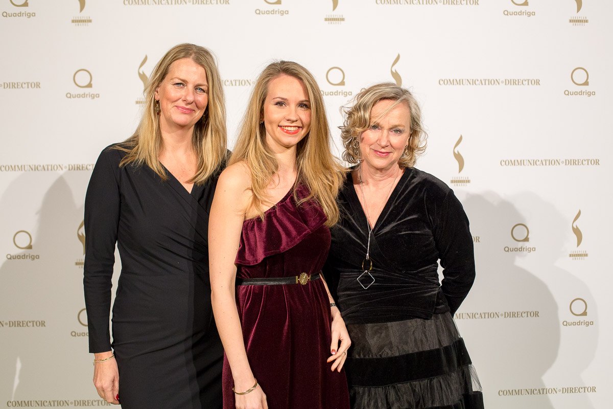 Drei Frauen posieren vor einer Fotowand bei den European Excellence Awards 2017 in Hamburg.