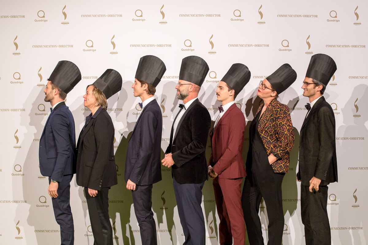 Eine Gruppe von sieben Personen in Anzügen trägt hohe Kochmützen und steht in einer Reihe vor einer dekorativen Wand.