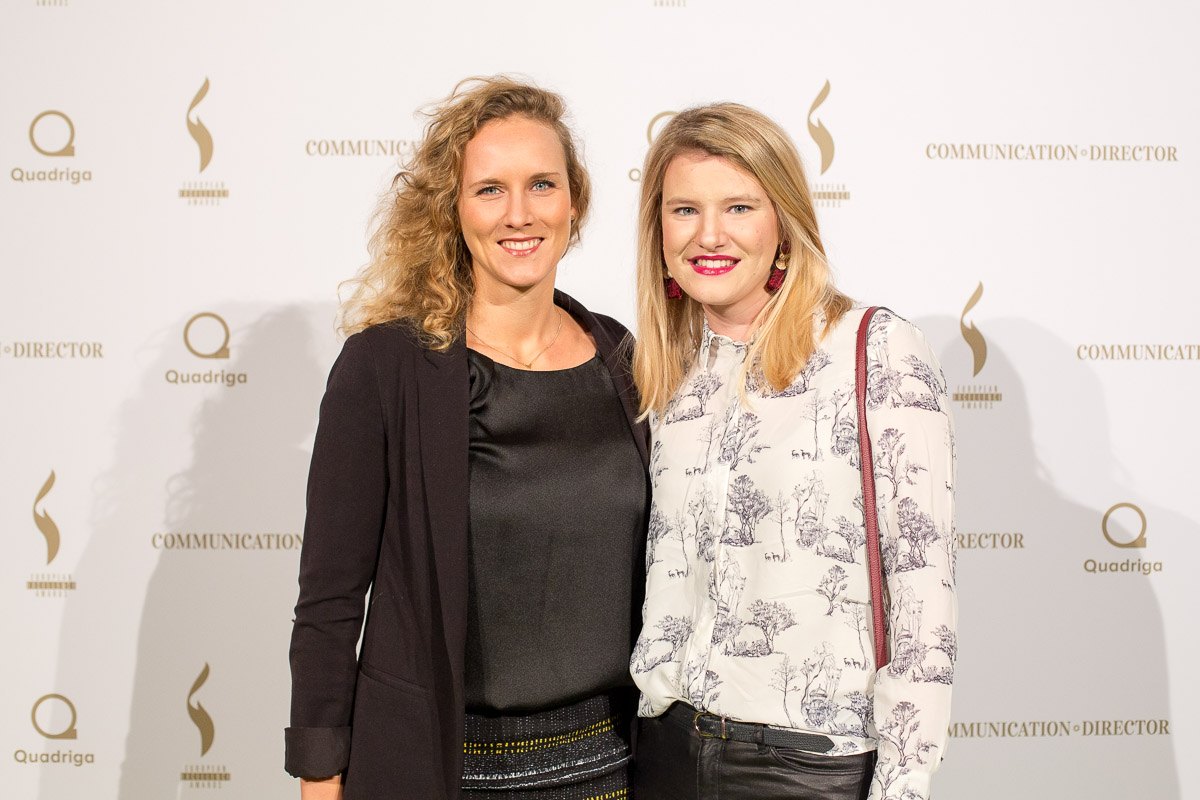 Zwei Frauen posieren lächelnd vor einer Fotowand mit dem Logo der European Excellence Awards.