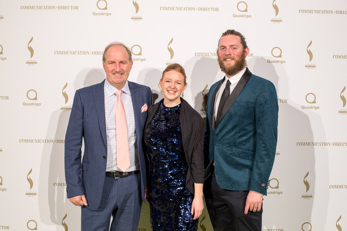 Drei Personen posieren lächelnd vor einer dekorativen Wand mit Logos der European Excellence Awards in Hamburg.