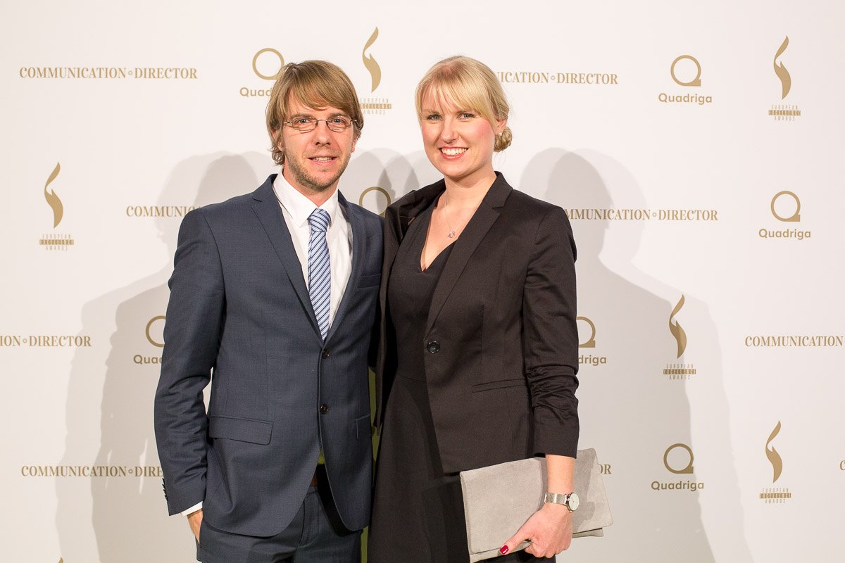 Paar in formeller Kleidung posiert vor einer Fotowand mit Logos der European Excellence Awards in Hamburg.