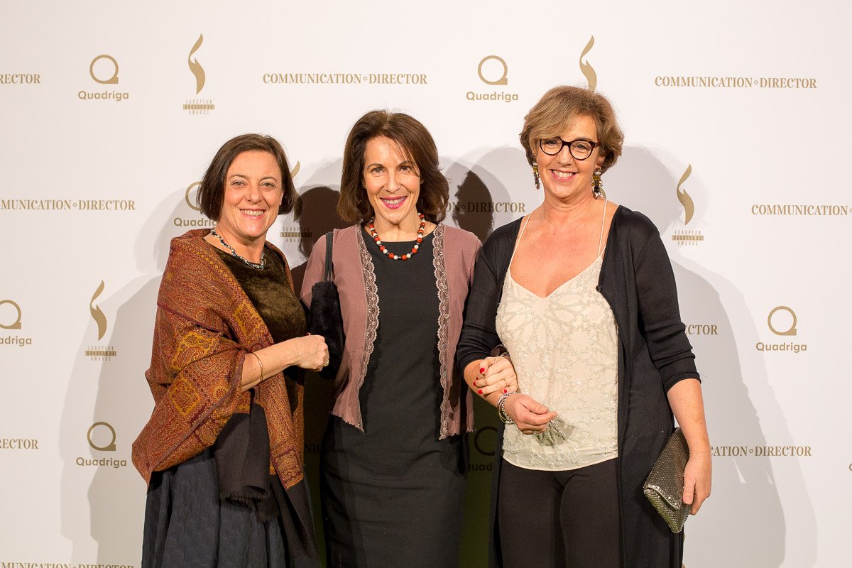 Drei Frauen posieren lächelnd vor einer Fotowand mit Logos der European Excellence Awards in Hamburg.