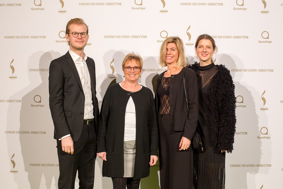 Vier Personen posieren vor einer Fotowand mit Logos der European Excellence Awards in einem eleganten Veranstaltungsraum.