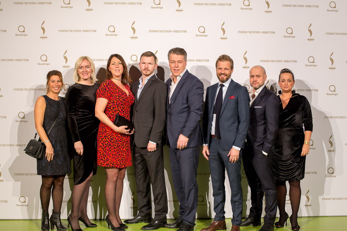 Gruppenszene von acht Personen in formeller Kleidung vor einer Fotowand bei den European Excellence Awards in Hamburg.