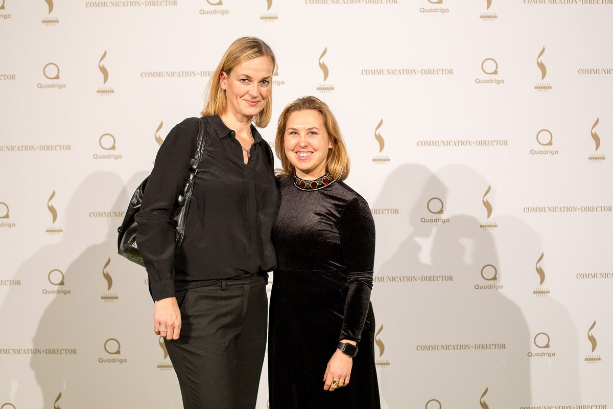 Zwei Frauen posieren lächelnd vor einer Fotowand mit Logos der European Excellence Awards in Hamburg.