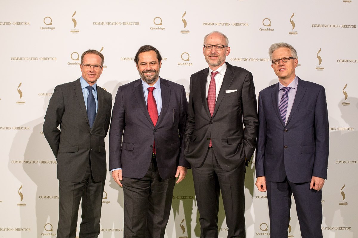 Vier Männer in Anzügen posieren vor einer dekorativen Wand mit Logos bei den European Excellence Awards in Hamburg.