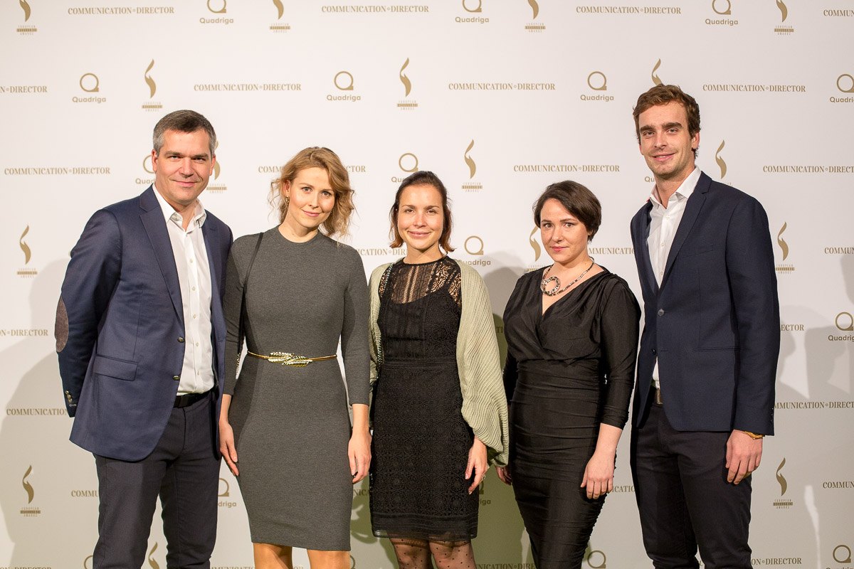 Fünf Personen posieren vor einer Wand mit dem Logo der European Excellence Awards in Hamburg.