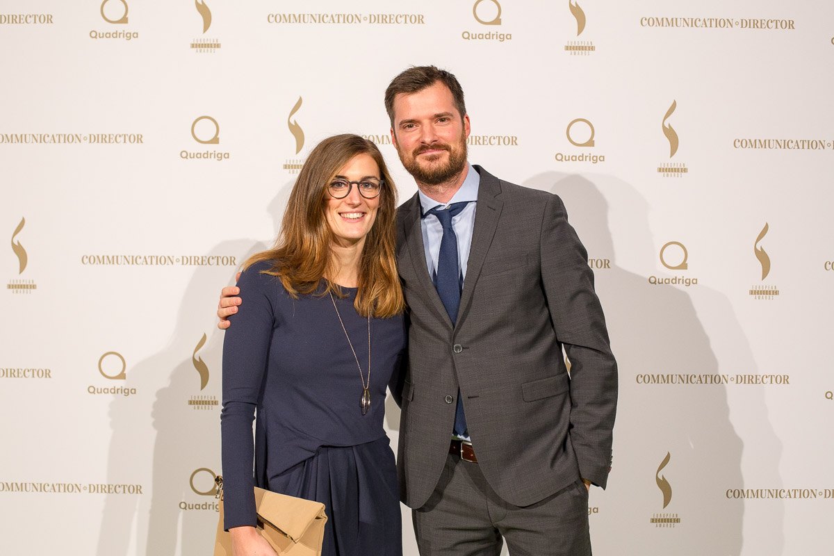 Paar posiert lächelnd vor einer Wand mit Logos bei den European Excellence Awards in Hamburg.