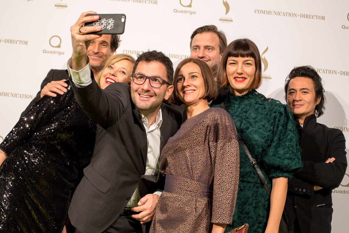 Gruppe von acht Personen posiert für ein Selfie vor einer Fotowand bei den European Excellence Awards in Hamburg.