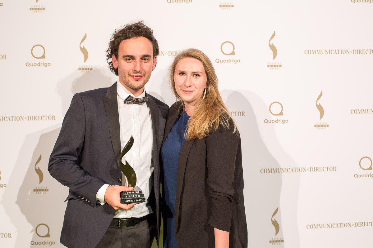 Zwei Personen posieren mit einem Preis vor einer Wand mit Logos der European Excellence Awards.