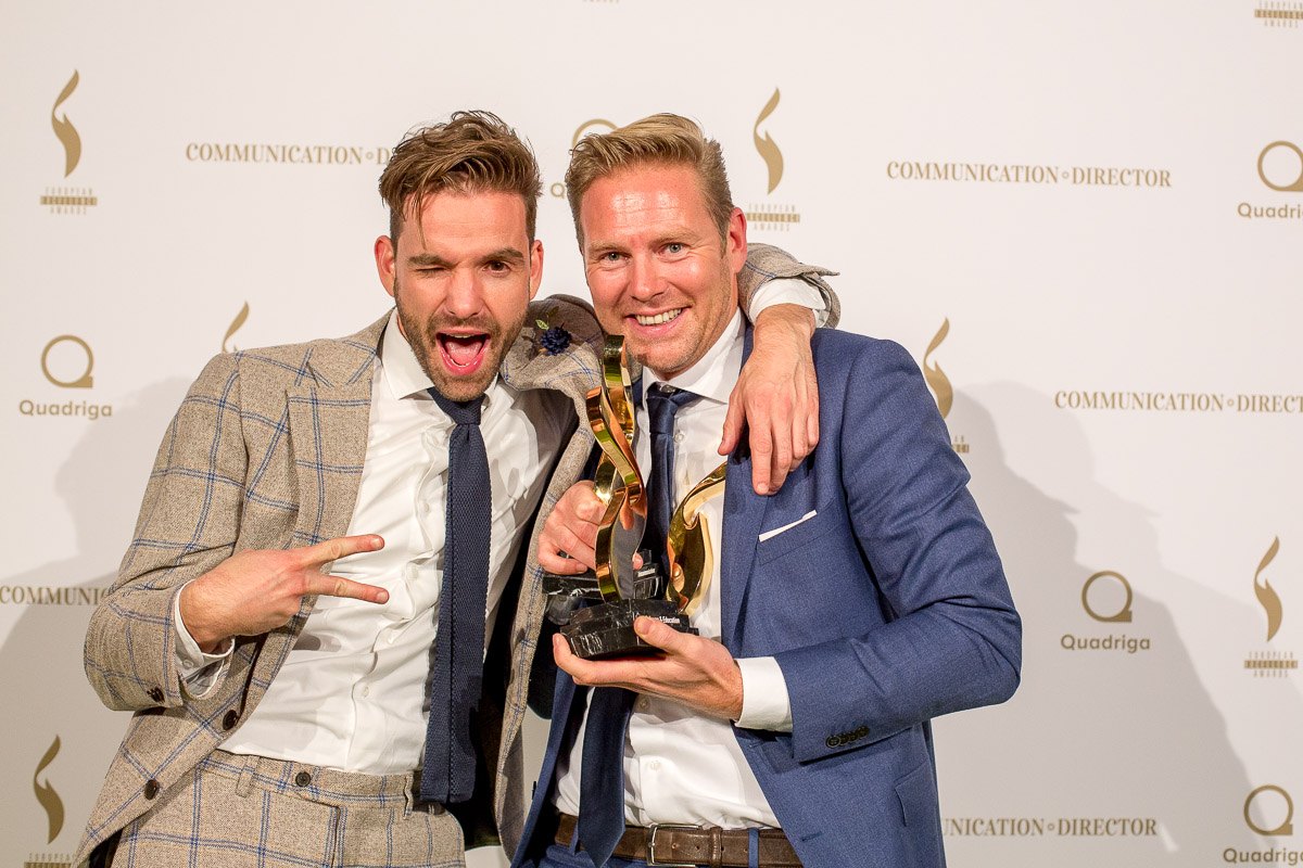 Zwei Männer in Anzügen posieren lächelnd mit einem Preis vor einer neutralen Wand mit Logos.