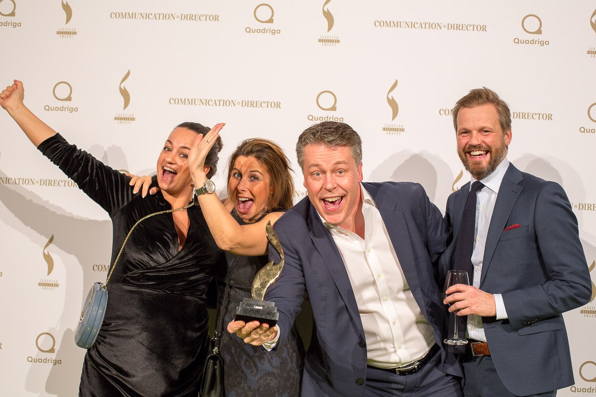 Vier Personen posieren fröhlich vor einer Fotowand mit dem Logo der European Excellence Awards und halten eine Auszeichnung.