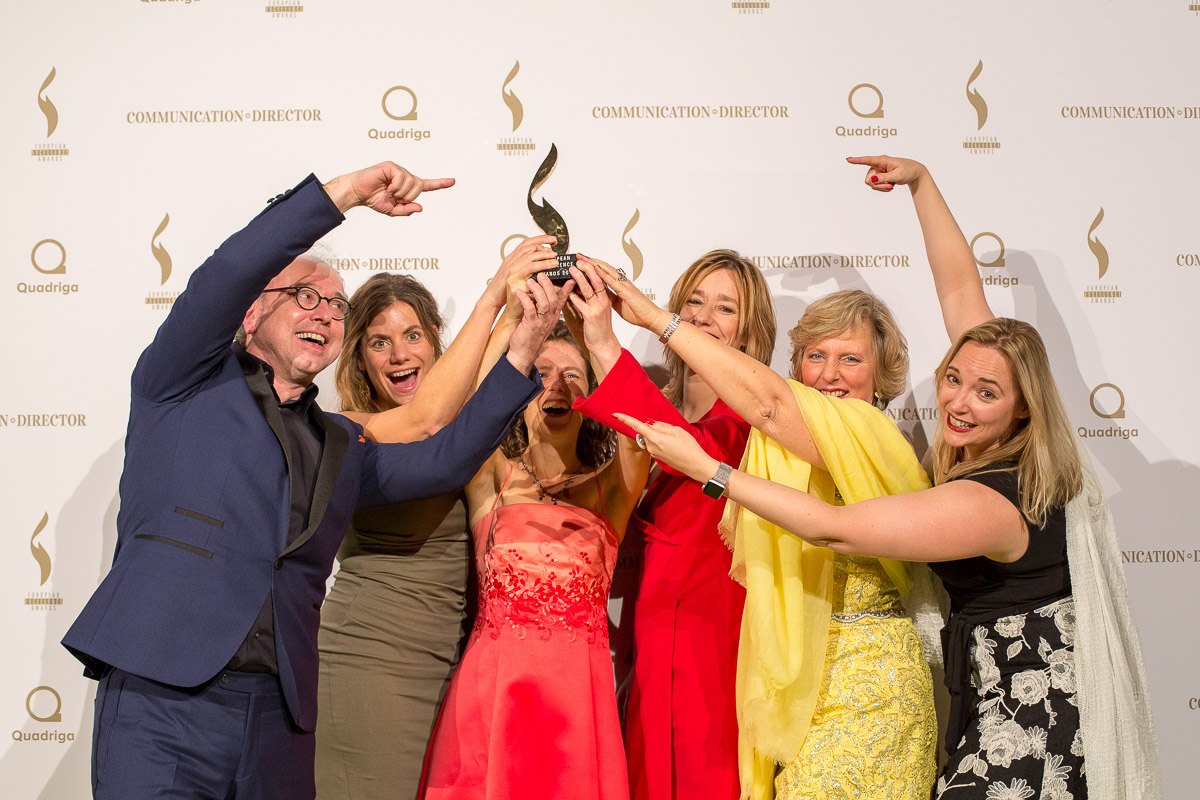Sechs Personen in festlicher Kleidung feiern und halten einen Preis vor einer dekorierten Wand bei den European Excellence...