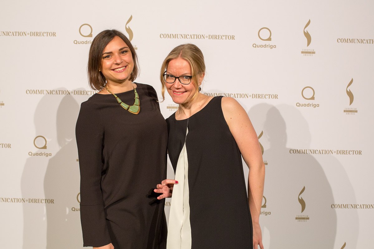 Zwei Frauen posieren lächelnd vor einer Fotowand mit Logos der European Excellence Awards in Hamburg.