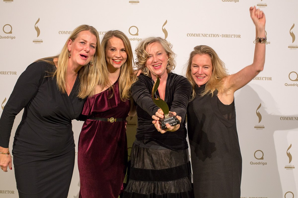 Vier Frauen posieren lächelnd mit einem Preis vor einer festlichen Wand bei den European Excellence Awards in Hamburg.