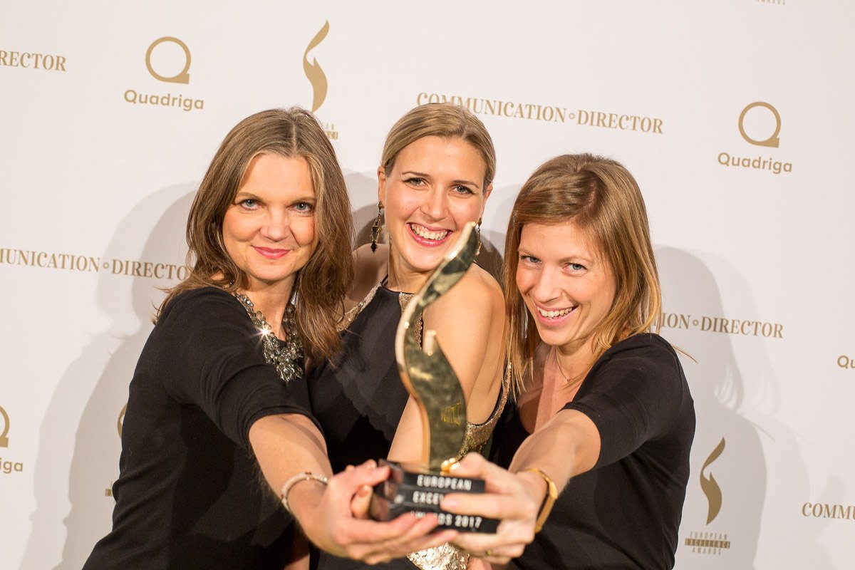 Drei Frauen posieren lächelnd mit einer Auszeichnung vor einer dekorativen Wand bei den European Excellence Awards 2017.