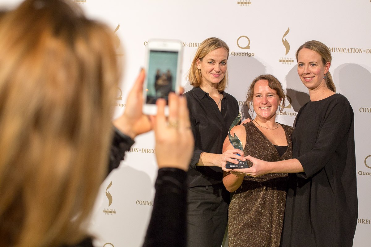 Drei Frauen halten eine Auszeichnung, während eine weitere Person im Vordergrund ein Foto mit ihrem Smartphone macht.