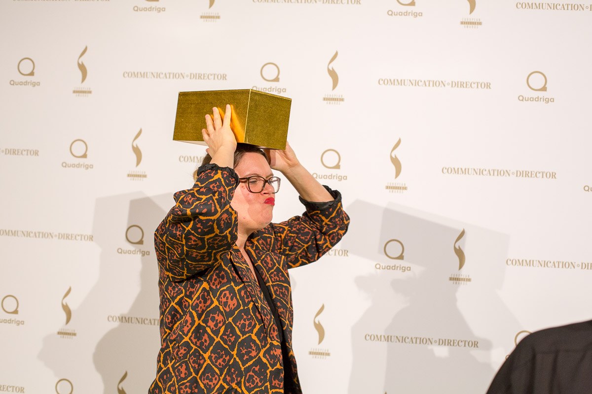 Frau mit Brille hält einen goldenen Preis über ihrem Kopf vor einer weißen Wand mit Logos der European Excellence Awards.