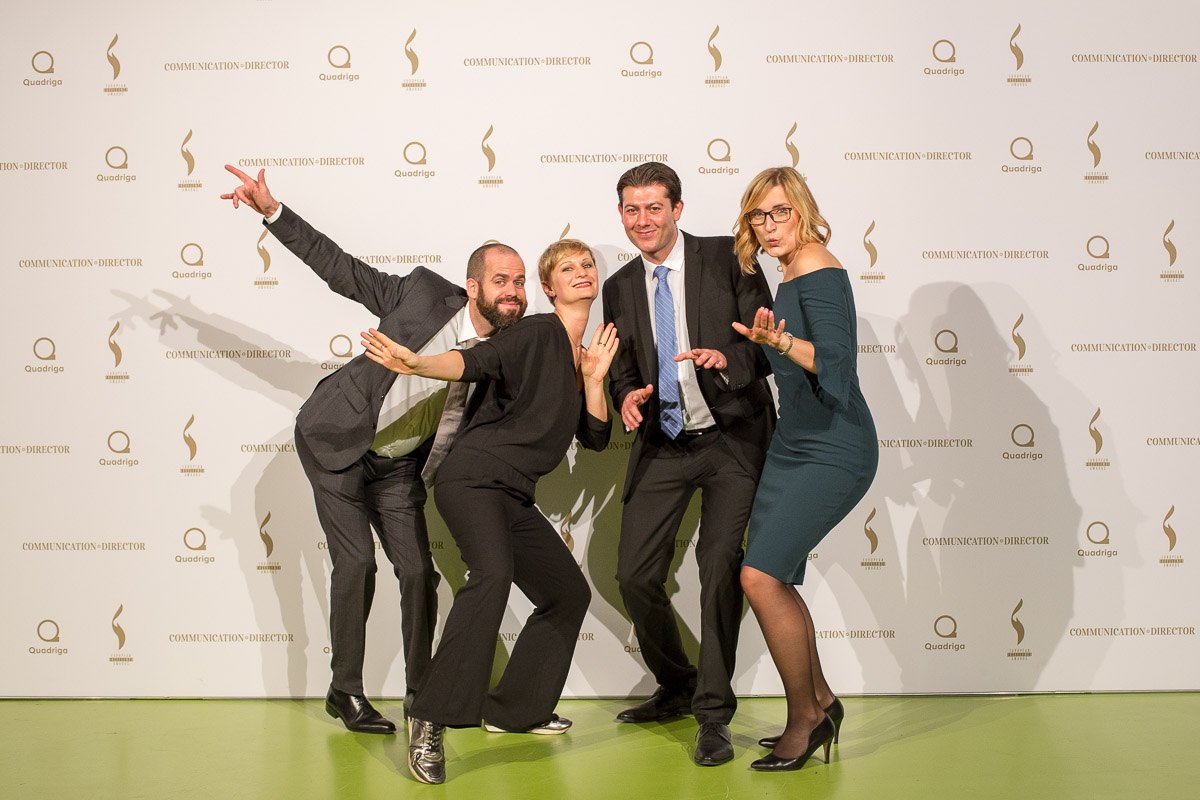 Vier Personen posieren fröhlich vor einer Fotowand mit dem Logo der European Excellence Awards in Hamburg.