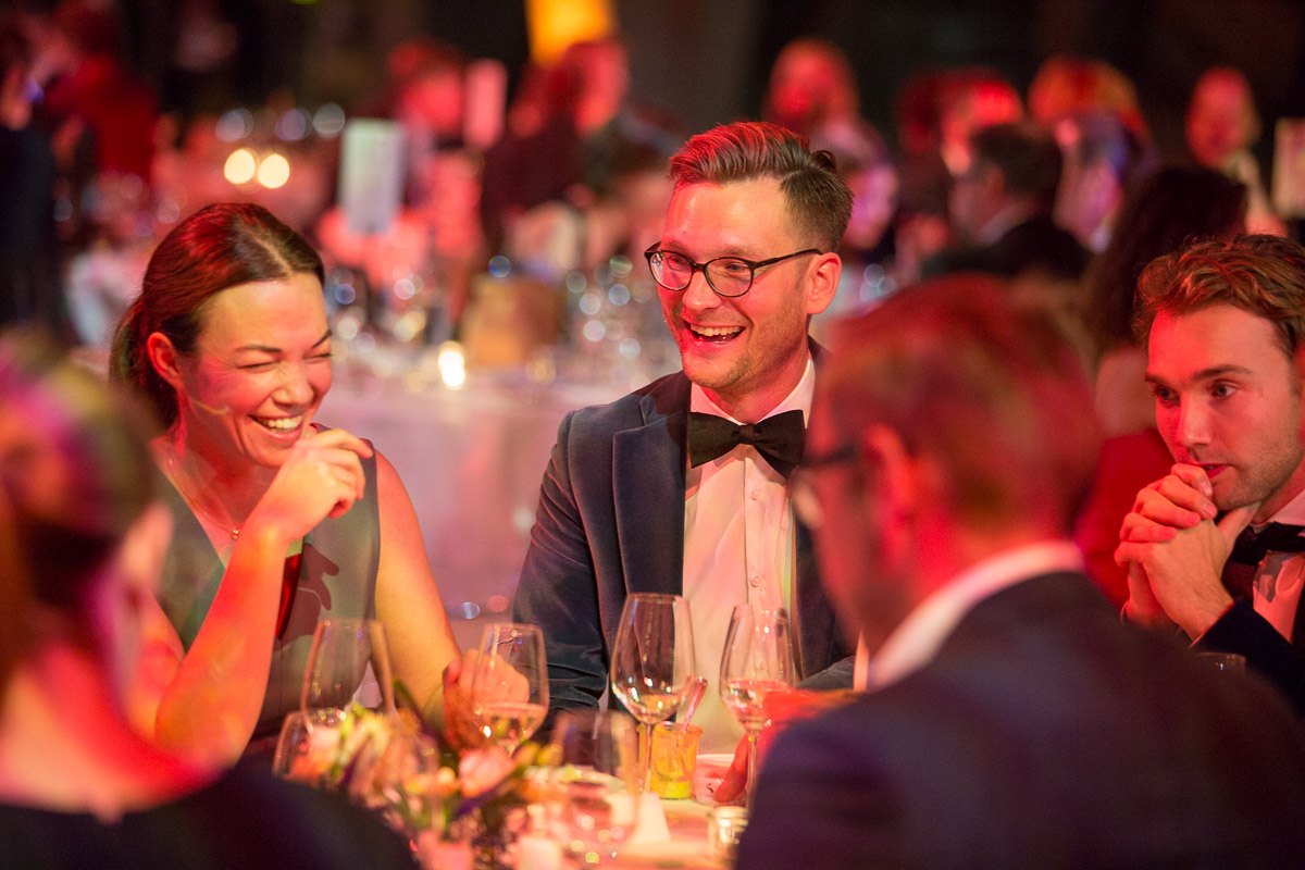 Lächelnde Gäste in eleganter Kleidung sitzen an einem festlich gedeckten Tisch bei den European Excellence Awards.