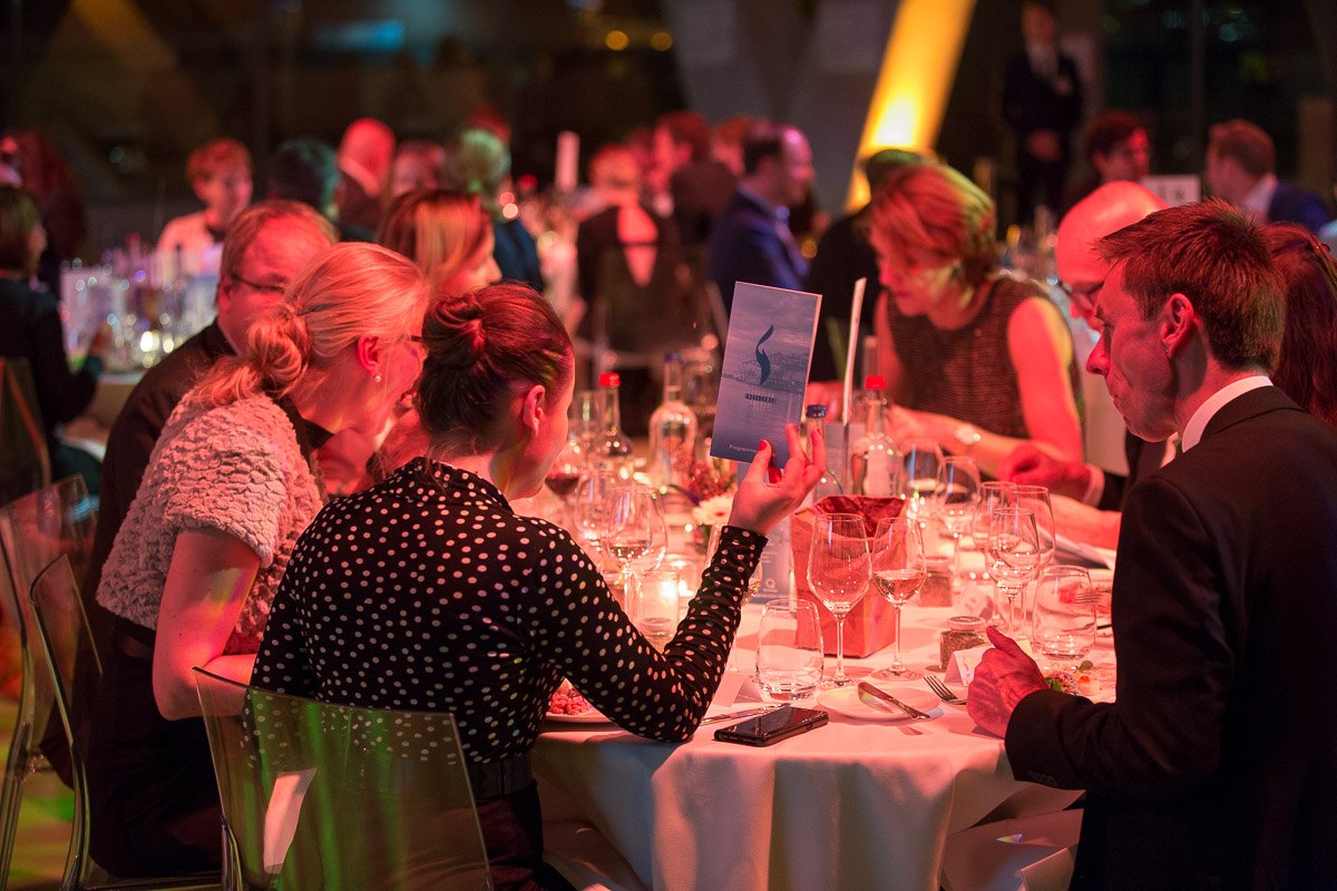 Gala-Dinner mit Gästen an festlich gedeckten Tischen, warmes Licht, eine Person hält eine Auszeichnung in der Hand.
