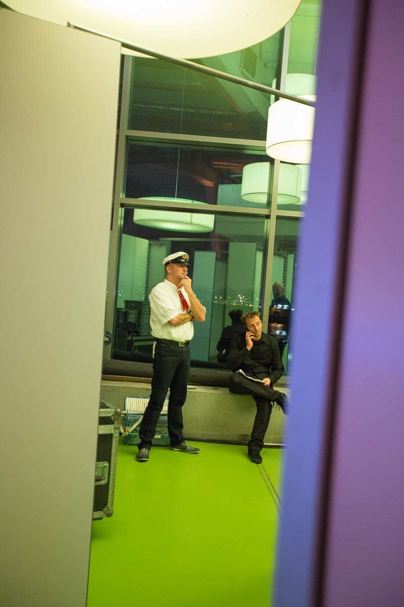 Zwei Männer in einem modernen Raum, einer trägt eine Kapitänsmütze, der andere sitzt nachdenklich.