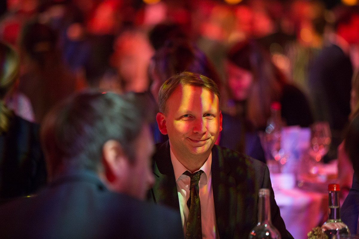 Mann in Anzug lächelt am Tisch bei der Gala der European Excellence Awards, umgeben von Gästen und festlicher Beleuchtung.