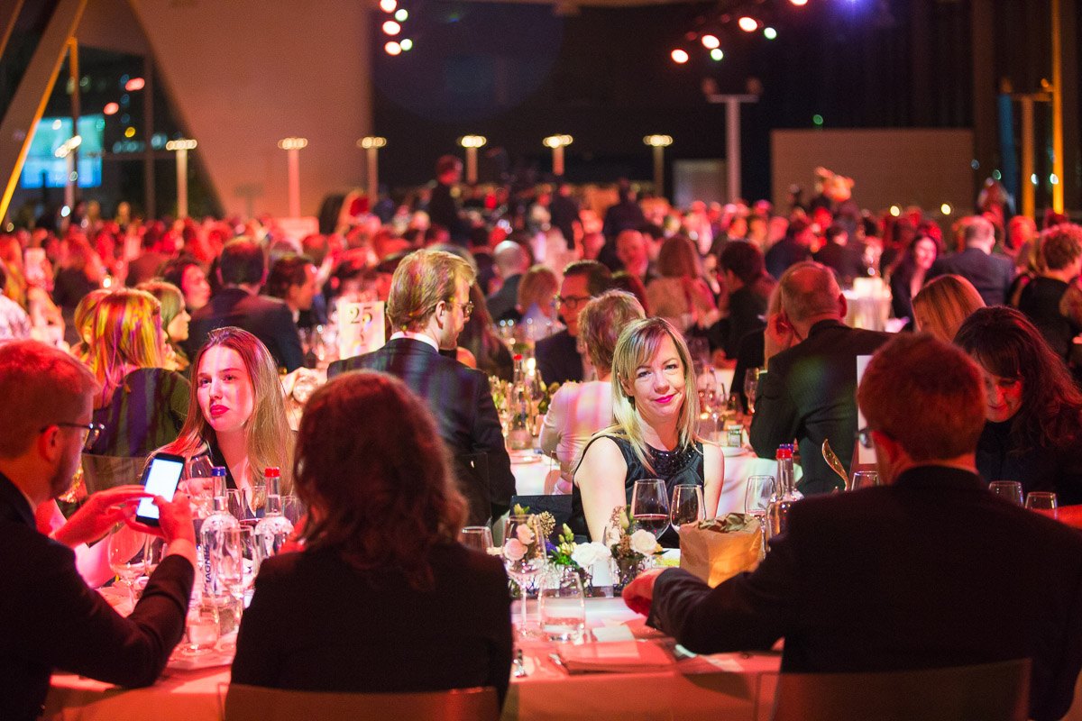 Elegante Gala mit Gästen an festlich gedeckten Tischen, stimmungsvolles Licht und zahlreiche Blumenarrangements.