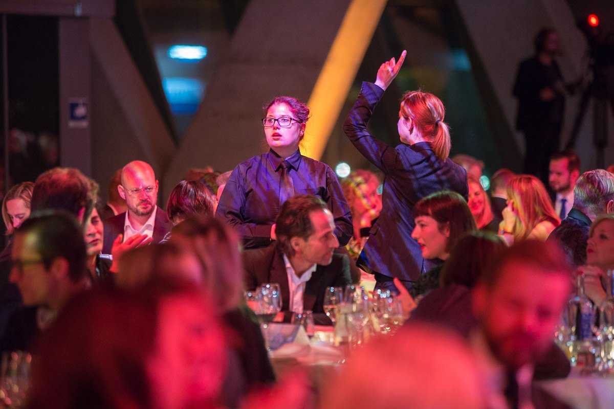 Menschenmenge in festlicher Atmosphäre bei den European Excellence Awards, mit Gästen an Tischen und einer Person im Vor...