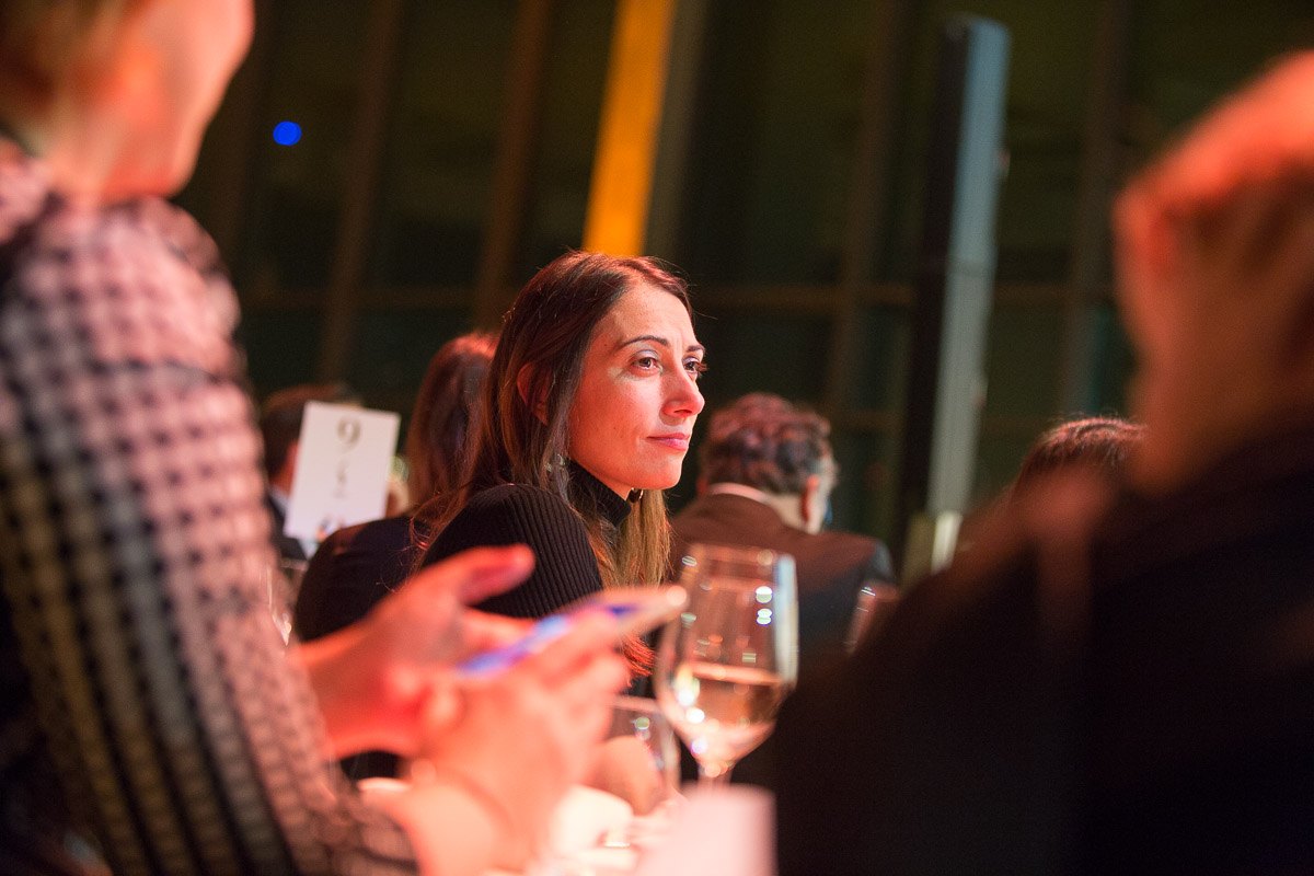 Frau mit langen, dunklen Haaren sitzt an einem Tisch, umgeben von anderen Gästen bei einer Gala-Veranstaltung.