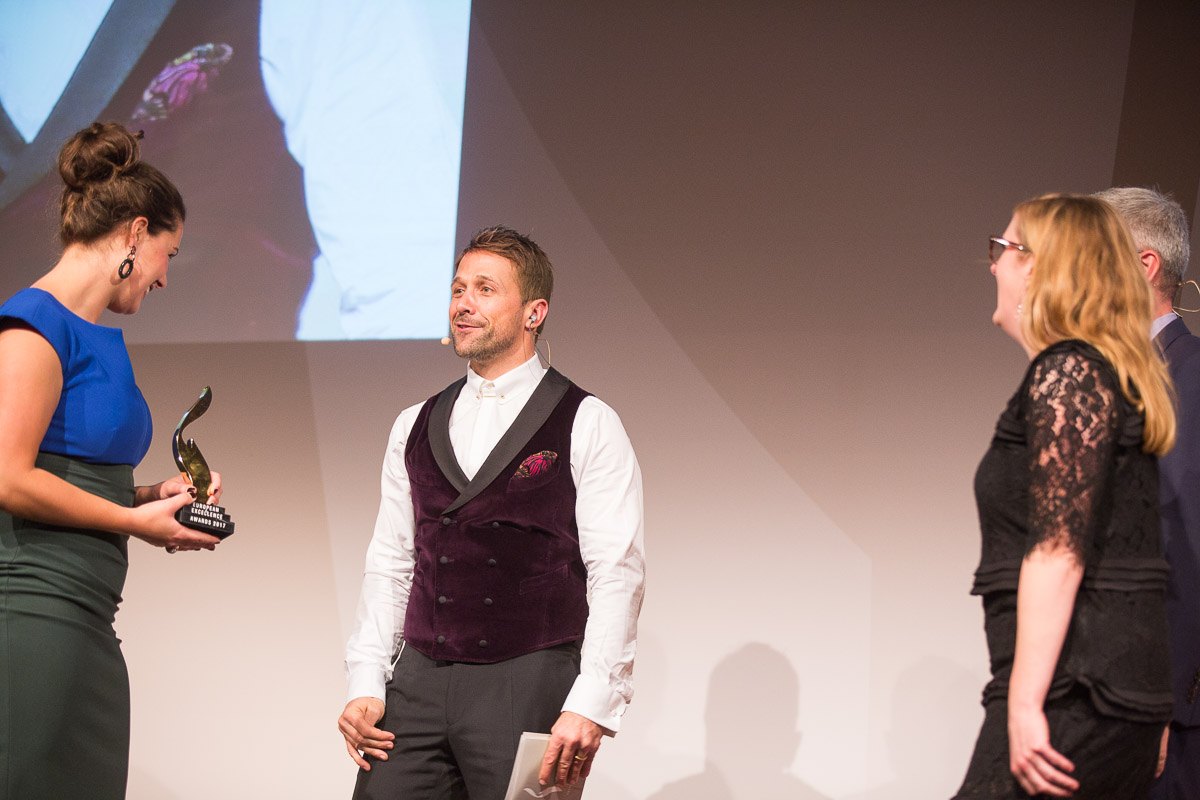 Zwei Personen auf der Bühne bei den European Excellence Awards, eine überreicht einen Preis, der Moderator spricht.