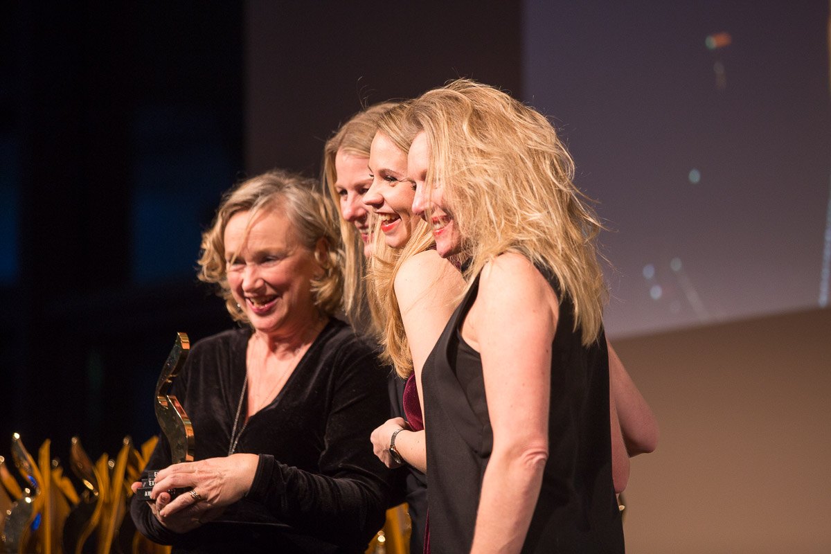 Vier Frauen stehen lächelnd auf einer Bühne und halten Auszeichnungen während der European Excellence Awards in Hamburg.