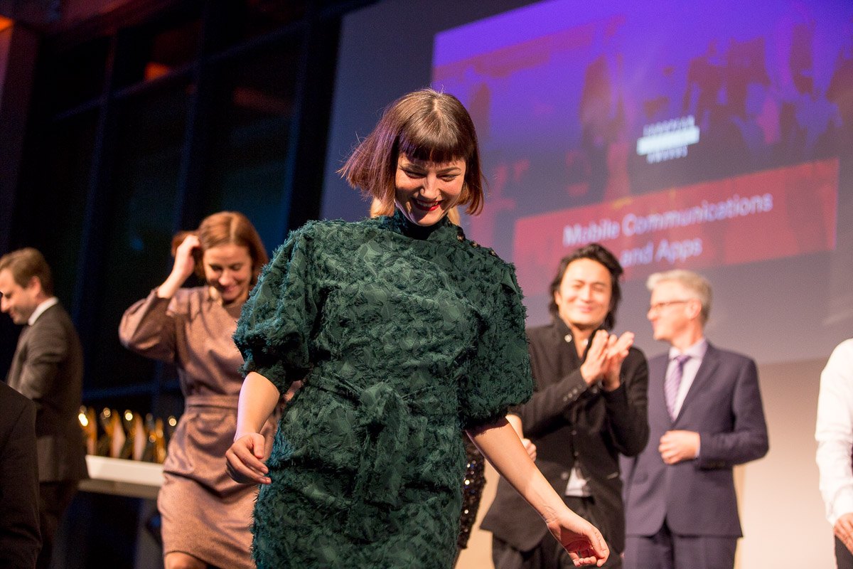 Frau in grünem Kleid geht lächelnd über die Bühne, umgeben von applaudierenden Personen bei den European Excellence Aw...