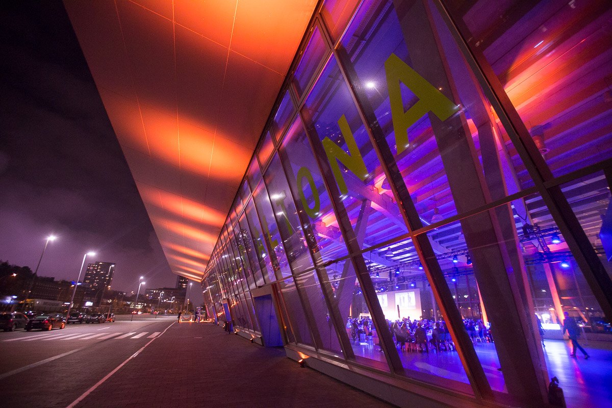 Beleuchtetes Hamburg Cruise Center bei Nacht, mit großen Fenstern und festlicher Veranstaltung im Inneren.