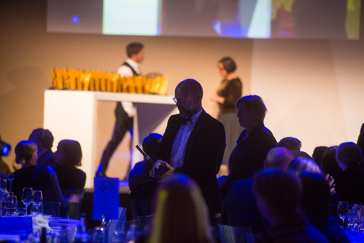 Gala-Event mit Gästen im Vordergrund, einem Tisch mit Auszeichnungen im Hintergrund und einer Präsentation an der Wand.