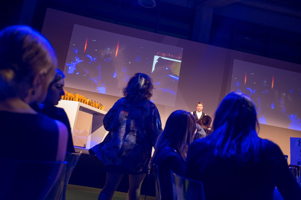 Veranstaltungsszene mit Gästen im Vordergrund, einem Redner auf der Bühne und Projektionen im Hintergrund.
