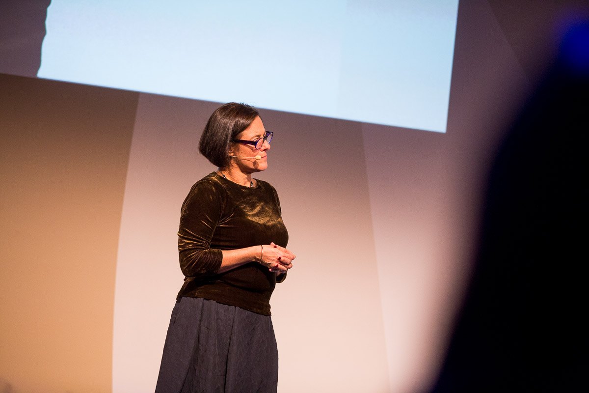 Frau mit Brille steht auf der Bühne und spricht, im Hintergrund ist ein Bildschirm sichtbar.